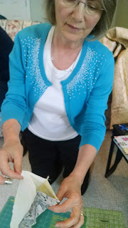 See??? Ruth S. is working on sewing down a binding for a Donation Quilt: