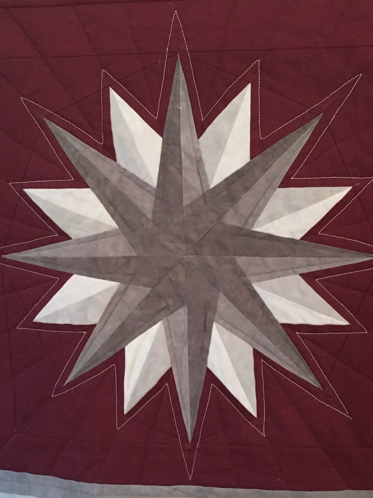 | Close up of one of the stars...look at those points and look at the radiating quilting! Well done Barry and Joanna! Everyone suggested this quilt should go in the NC Symposium show. |