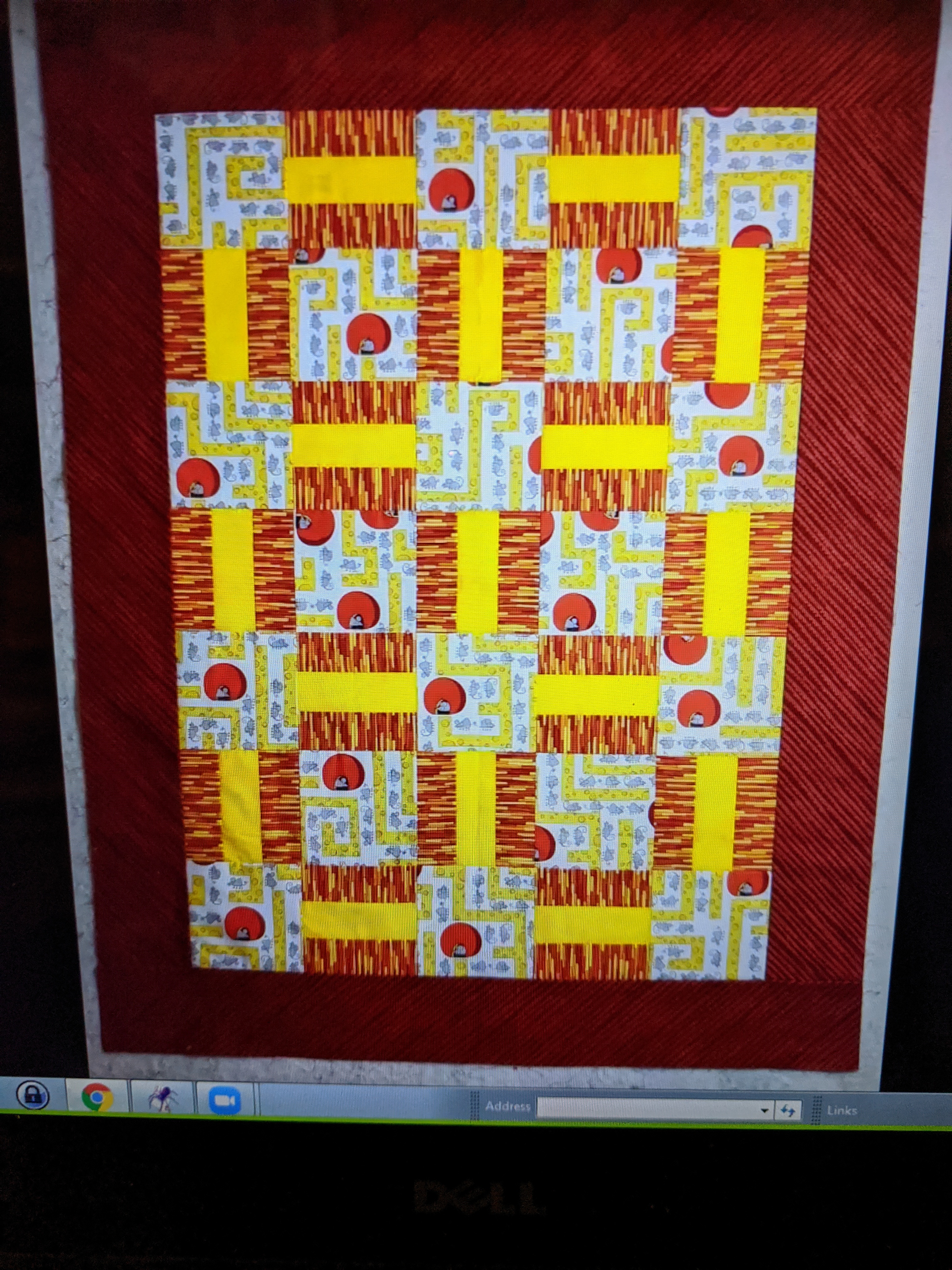 Joy: made a lovely red table quilt for her mail carrier. Shared a sweet 10”x12” mini quilt that was match stick quilted on her long arm! Made another red mini quilt for her gallery wire. Joy was able to load six small quilts on her long arm at one time! Purchased a lovely assortment of fabric (10 lbs) at Pineapple Fabrics. Joy shared a sneak peak at a gorgeous colorful quilt for her niece.